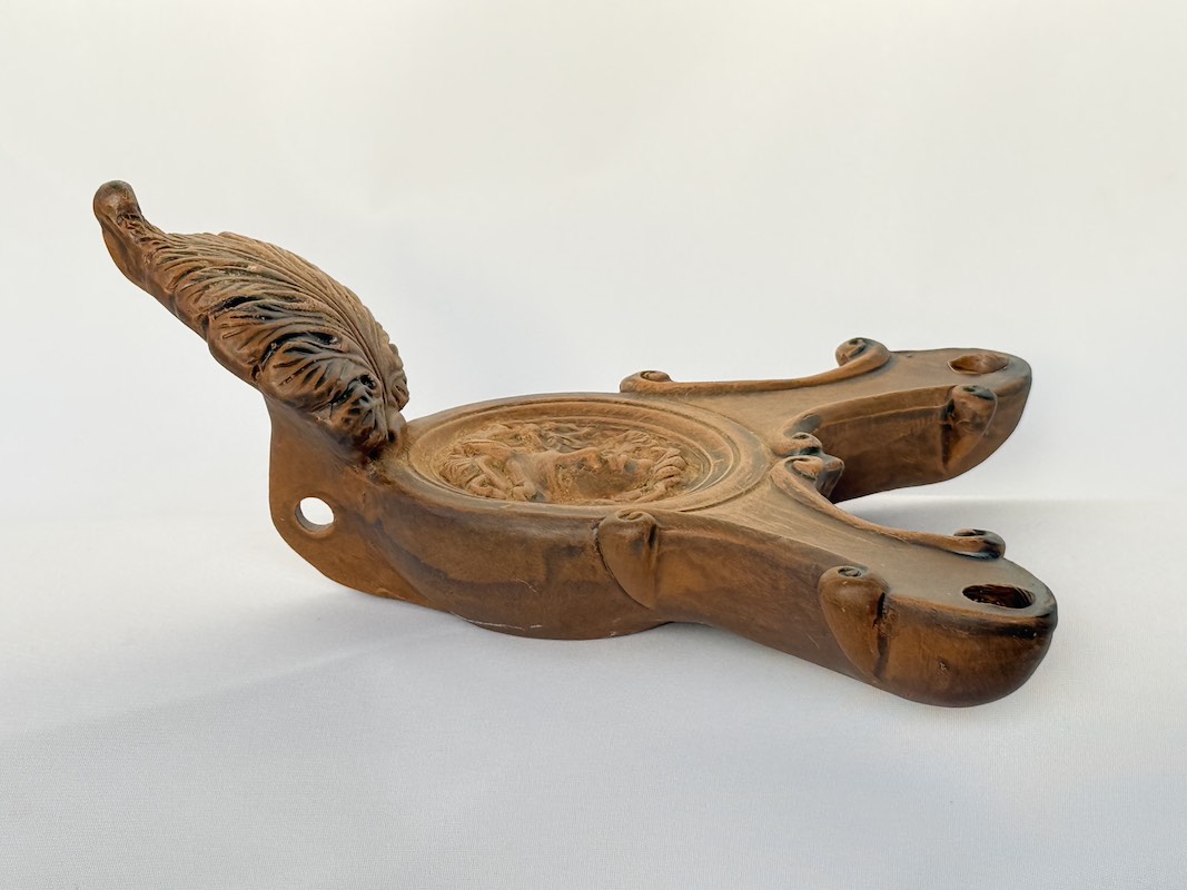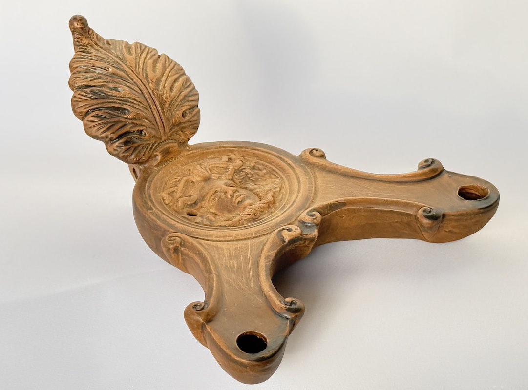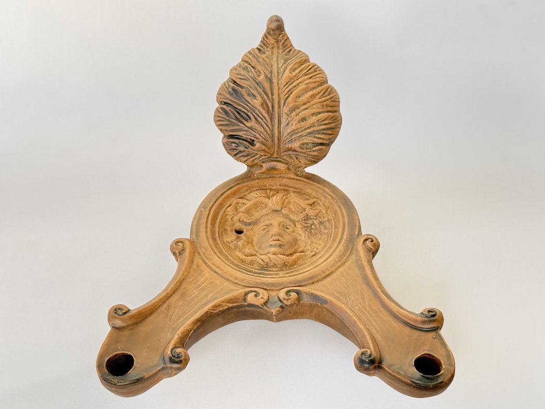 Lucerna de doble piquera con motivo de Medusa en el disco. Asa plástica en forma de hoja.
